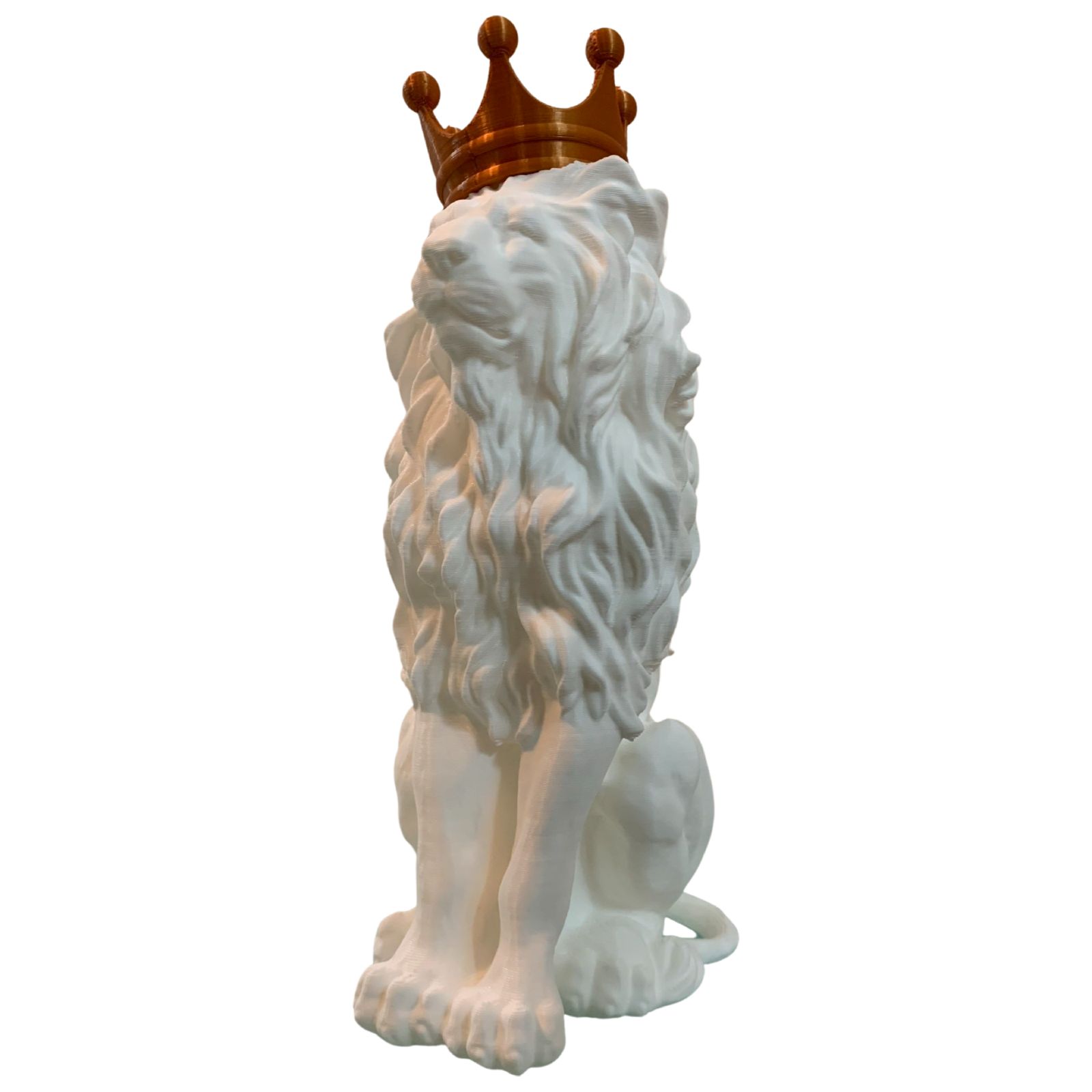 Leão decorativo fabricado em Plástico na cor Branca com coroa dourada.